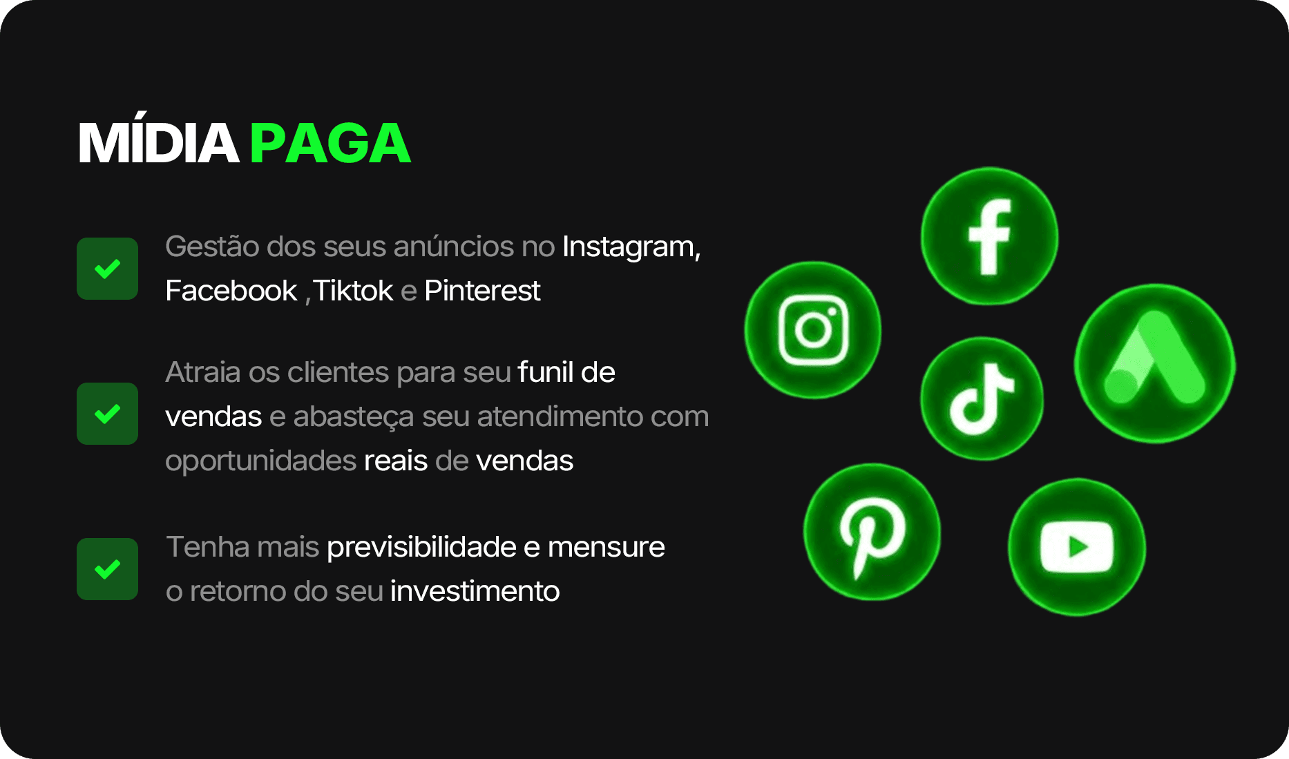 Serviços de mídia paga, produção de materiais criativos, CRM, gestão e atendimento