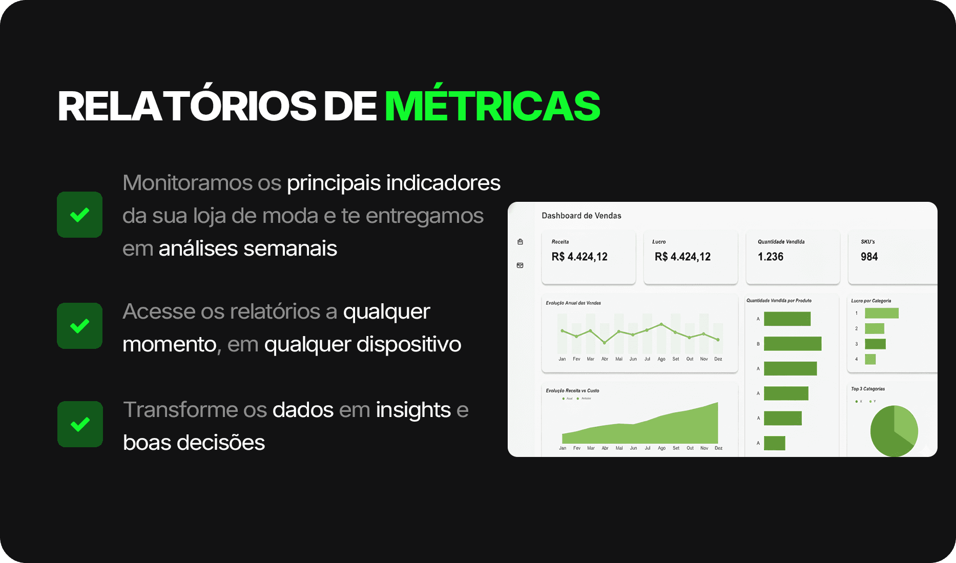 Oferecemos nossos serviços por planos flexíveis. Você escolhe conforme sua condição atual. O mais importante é continuar apostando em estratégias que trazem resultado.